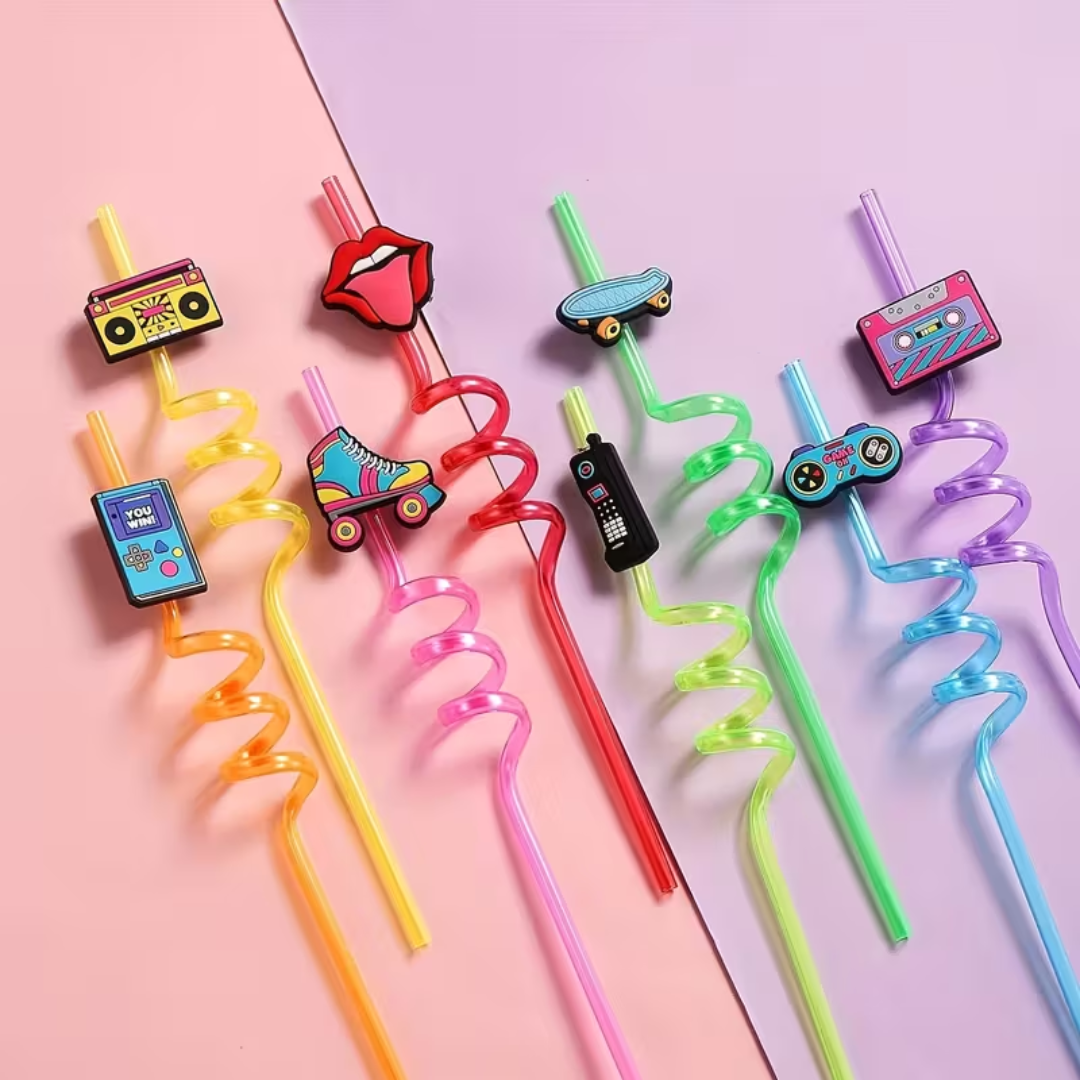 8er-Set Retro 90er Strohhalme – Bunte Kunststoff-Trinkhalme mit Kult-Motiven (lebensmitteltauglich)
