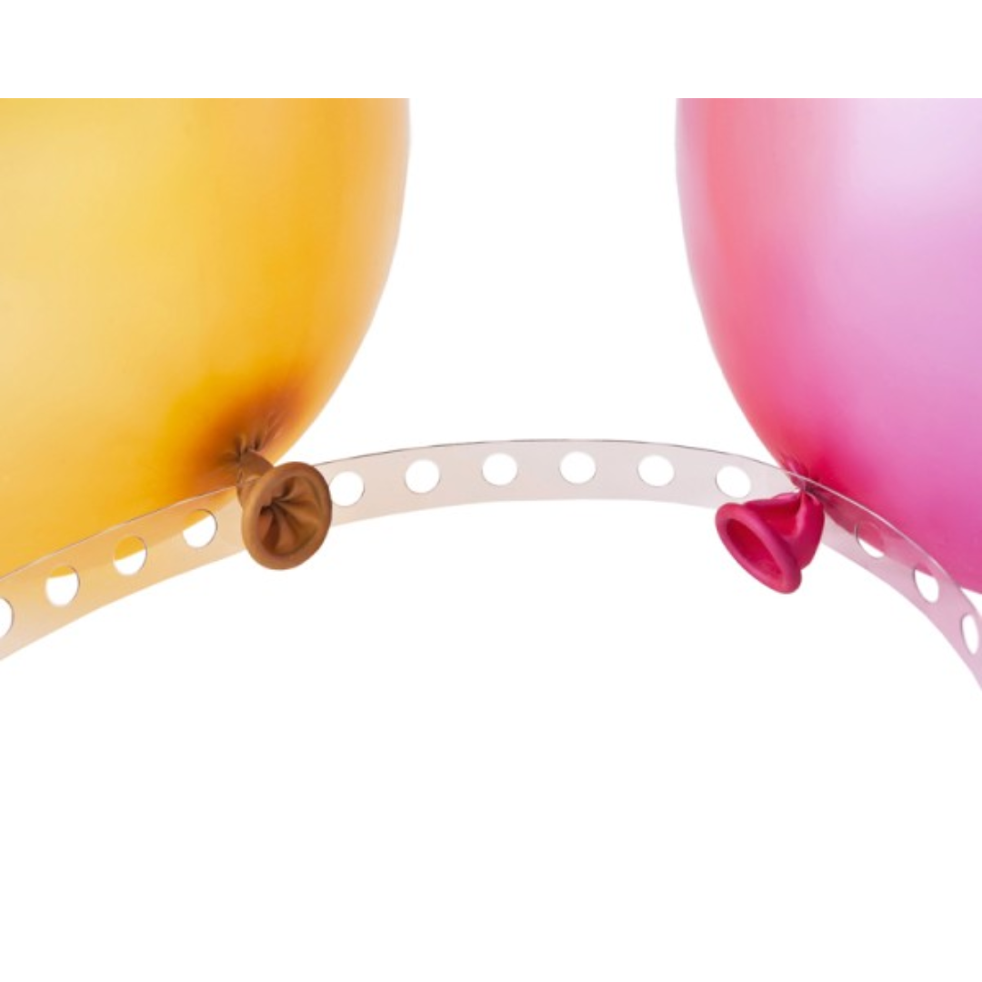 Mit dem Ballongirlanden-Band baust du im Handumdrehen beeindruckende Ballonarrangements ganz ohne Helium. Die regelmäßigen Lochungen halten die Ballons sicher an Ort und Stelle, lassen sich dicht oder mit Abstand bestücken und ermöglichen individuelle Formen – vom klassischen Bogen bis zur Wellen- oder S-Form. Das Band ist transparent, leicht und stabil genug für mehrreihige Designs. Einfach auf die gewünschte Länge kürzen, Ballons (luftgefüllt) einhängen und die Girlande am Wunschort fixieren.