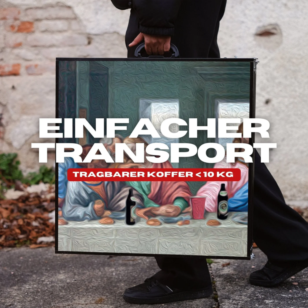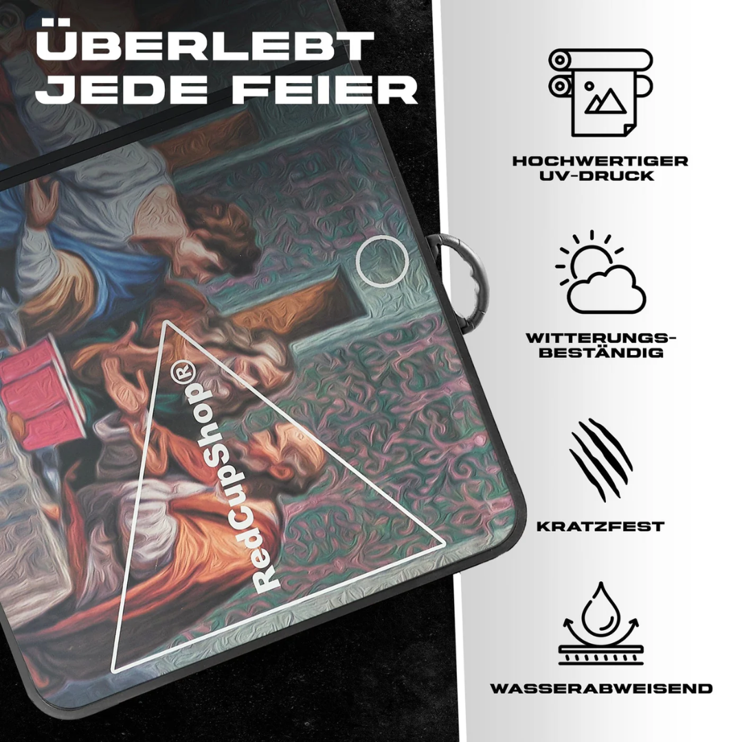 Der Beer Pong Tisch "Letztes Abendmahl" vereint Qualität, Funktionalität und kreatives Design in einem. Gefertigt aus leichtem Aluminium ist er nicht nur robust, sondern auch besonders mobil. Dank des cleveren Klappsystems verwandelst du ihn im Handumdrehen vom handlichen Kofferformat in einen vollwertigen Turniertisch.