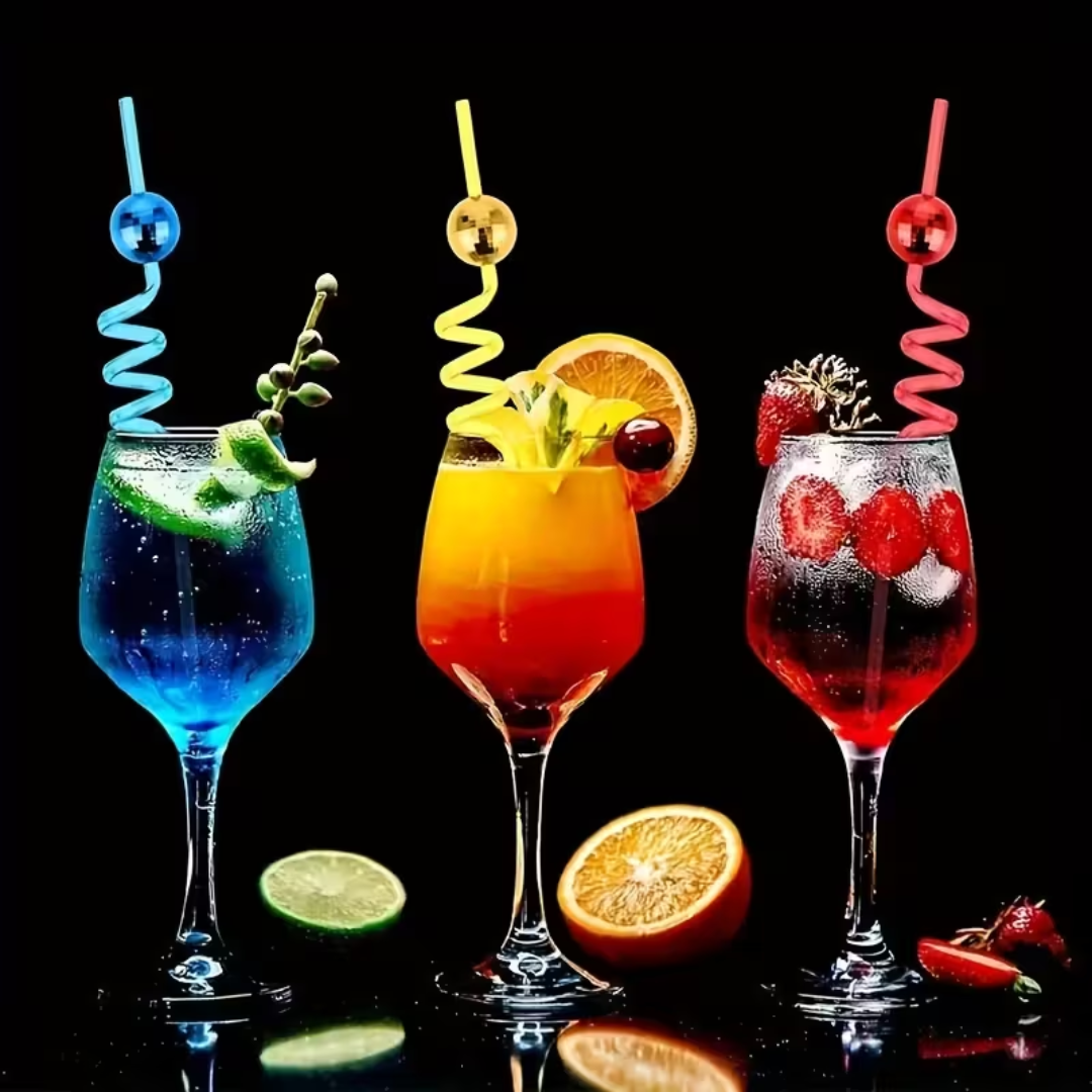 - 8 bunte Spiral-Strohhalme mit glänzenden Disco-Kugeln