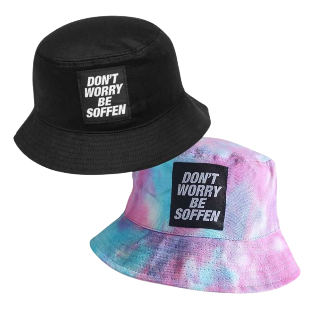 Der Fischerhut DON'T WORRY BE SOFFEN ist kein gewöhnlicher Hut, sondern ein Statement für alle, die wissen, wie man feiert. Eine Seite knallig pink mit dem legendären Spruch, die andere Seite schlicht schwarz. So entscheidest du selbst, ob du heute auffallen oder es entspannt angehen willst.