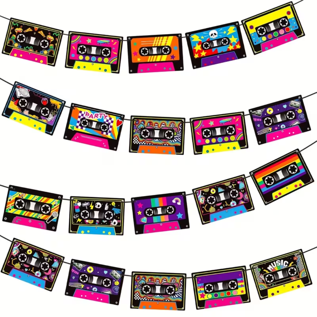 Die Kassetten-Girlande bringt Retro-Feeling pur: Klassische Kassettentapes in bunten Farben, die jede Wand, Tür oder den Partyraum verzieren. Ob für die nächste 80er-Mottoparty, ein 90er Revival oder einen Hip-Hop-Abend – diese Girlande sorgt sofort für den richtigen Look. Mit 3,66 Metern Länge ist sie flexibel einsetzbar und kann mehrfach verwendet werden. Ein Muss für alle Retro-Fans, die ihre Feier optisch unvergesslich machen wollen.
