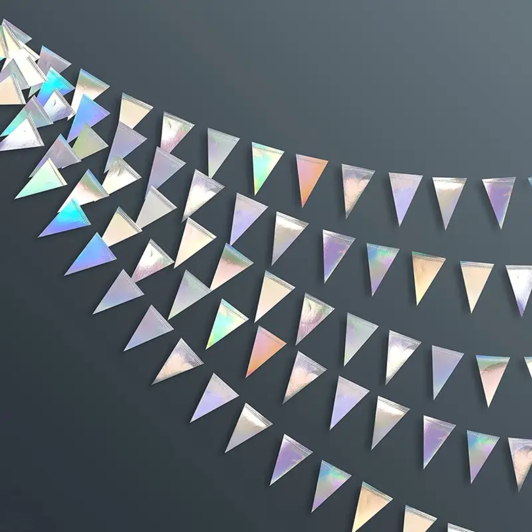 Die holografische Wimpelkette ist das Must-have für moderne Partydeko! Ihr irisierender Glanz sorgt für funkelnde Effekte, die je nach Lichteinfall in allen Farben des Regenbogens schimmern – perfekt für Geburtstage, Motto-Partys oder elegante Events.