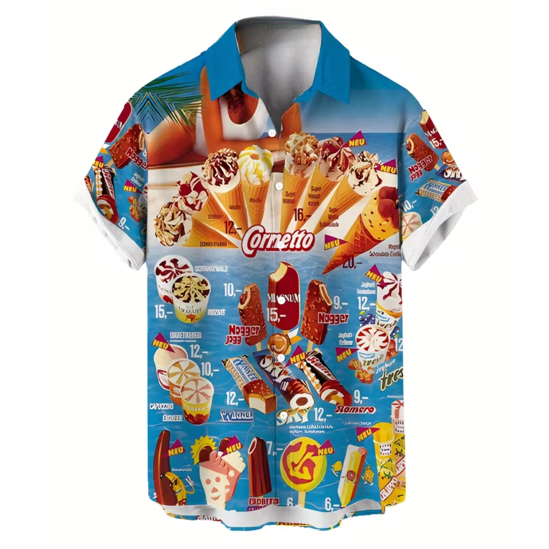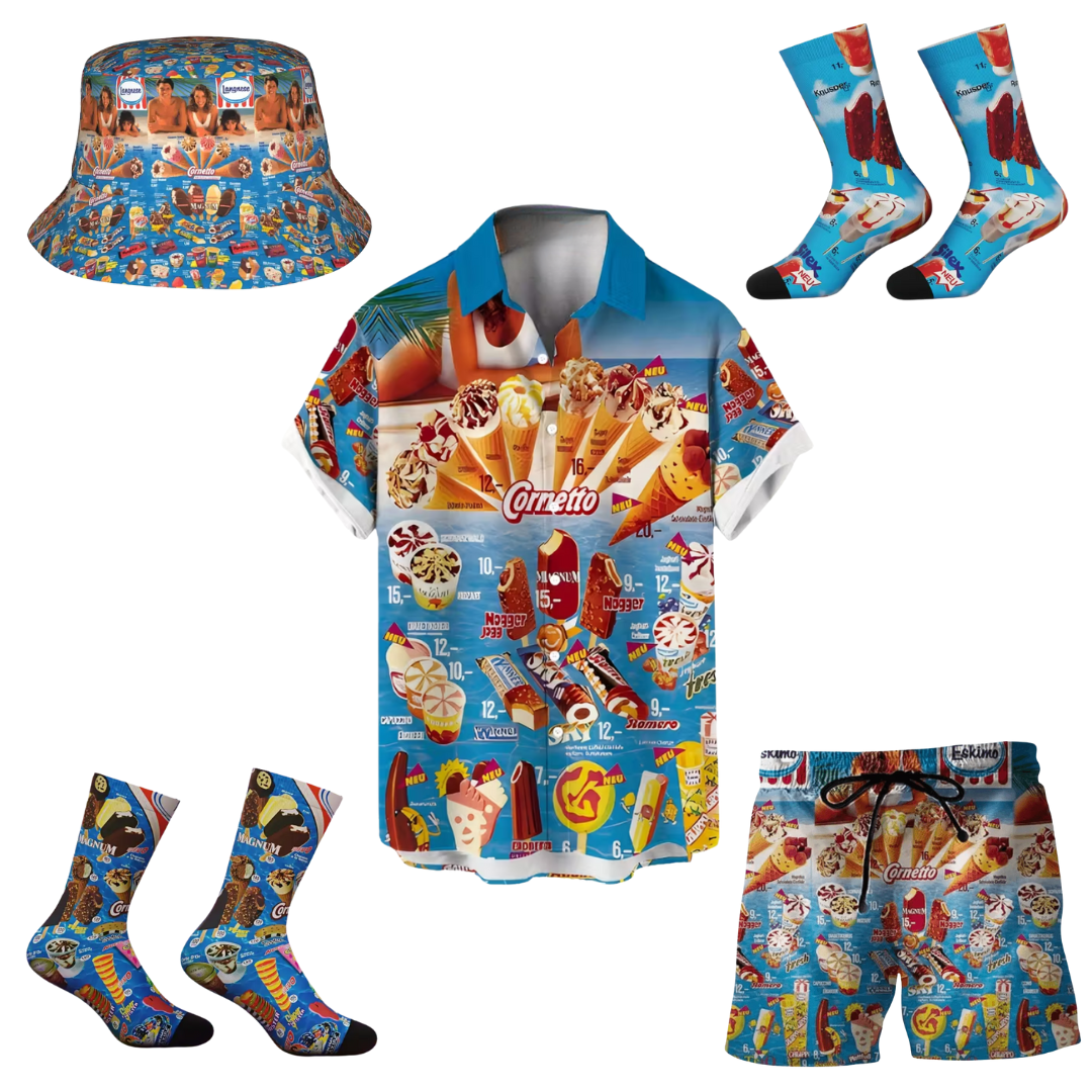 HOT ICE Kollektion – Hemd, Fischerhut, Shorts & Socken im 90er-Eiskarten-Design