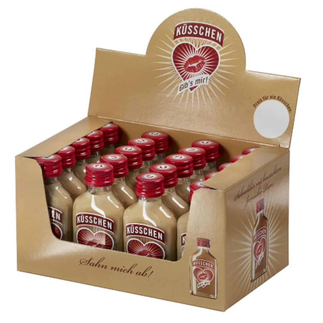 KÜSSCHEN ist der Likör, der keine langen Umwege macht: cremige Konsistenz, süße Note und satte 20 % vol. Alkohol machen ihn zu einem echten Verführer. Ob als kleiner Shot zwischendurch, als Partygag oder als süße Überraschung – die Glasfläschchen passen zu jeder Gelegenheit. Der Geschmack ist weich und cremig, aber mit ordentlich Power – ein kleiner Drink, der Eindruck hinterlässt. Perfekt, um Abende charmant einzuleiten oder sie mit einem Augenzwinkern zu beenden.