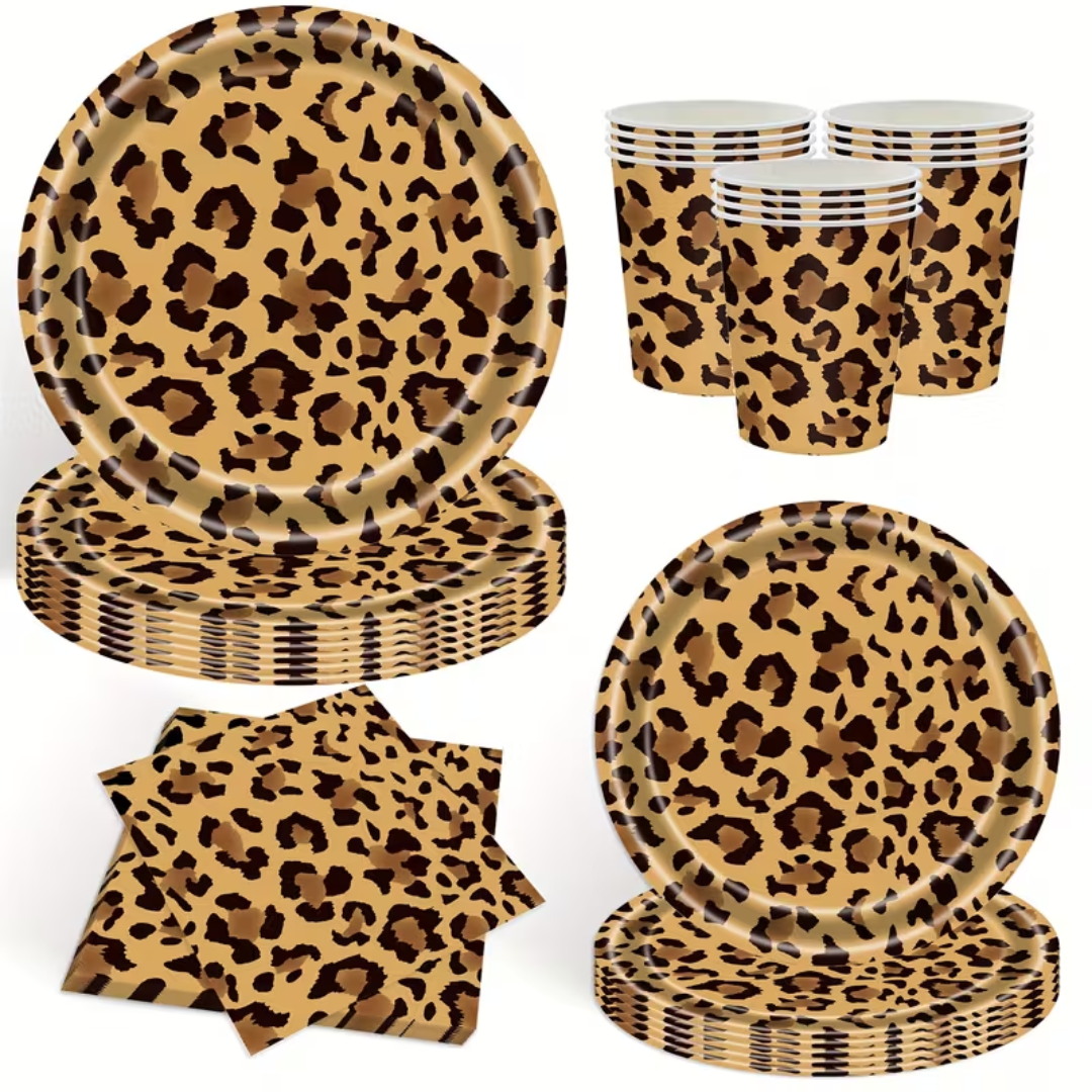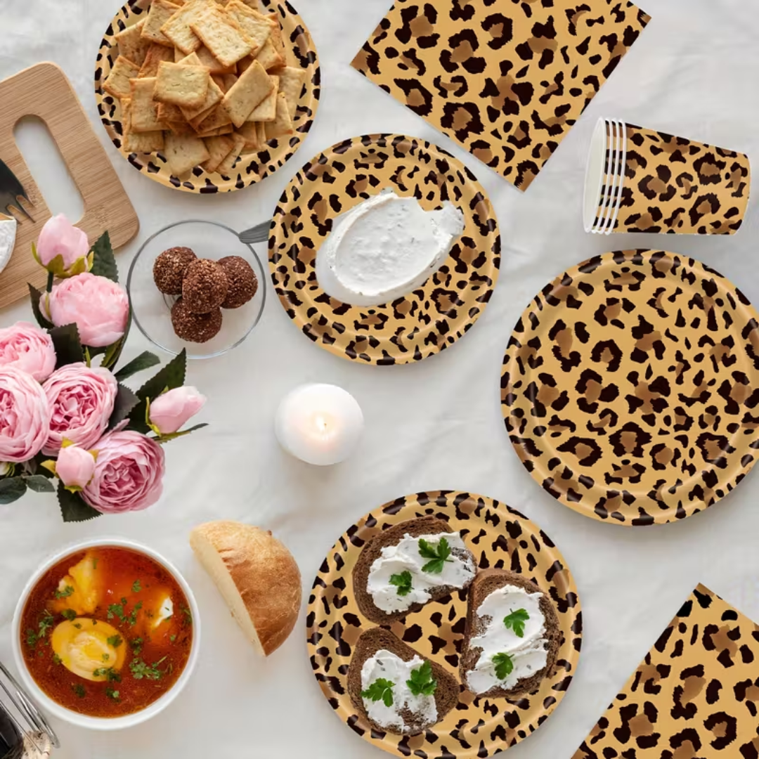Von Fingerfood bis Geburtstagstorte – die großen und kleinen Teller decken alles ab, die Becher sind ideal für Softdrinks & Schorlen, und die Servietten fangen kleine Missgeschicke zuverlässig auf. Das durchgehende Leopardenmuster sorgt für einen modernen, fototauglichen Look – drinnen wie draußen.