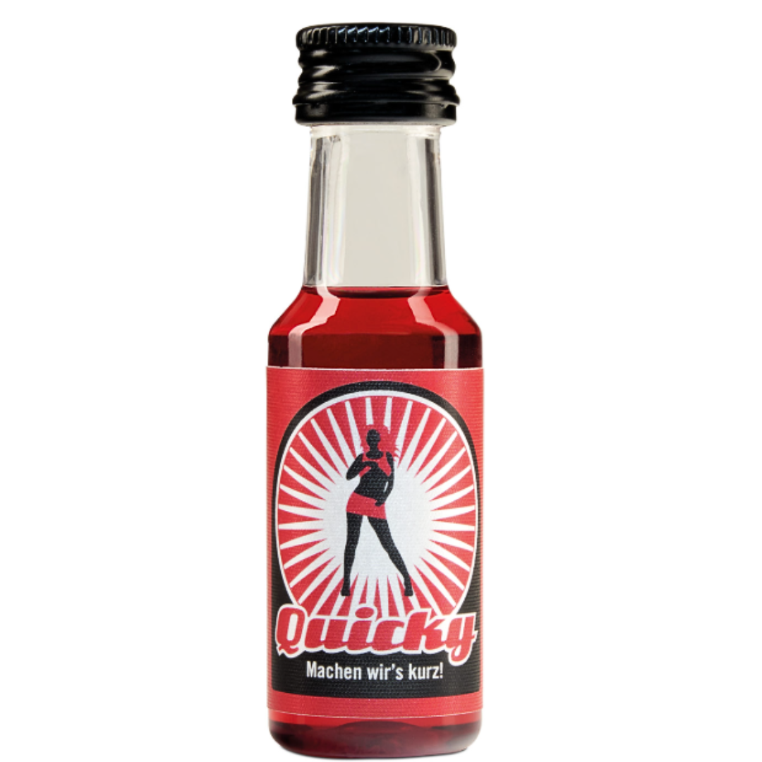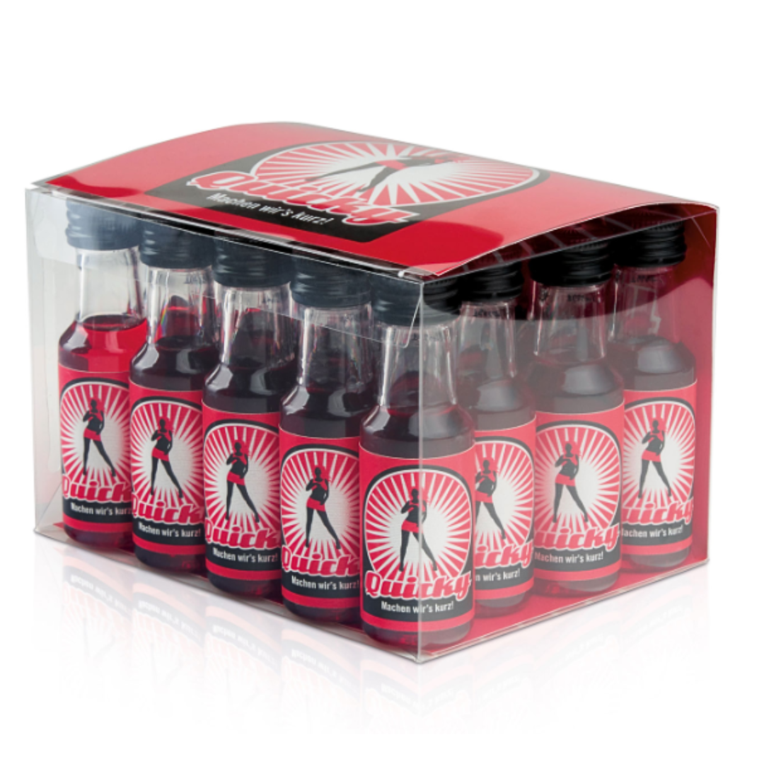 QUICKY macht seinem Namen alle Ehre: schnell getrunken, sofort spürbar und seit über 20 Jahren ein echter Klassiker in der Partyszene. Mit 20 % vol. und süß-fruchtigem Geschmack ist er kein Likör für langes Philosophieren – sondern für spontane Entscheidungen und legendäre Abende. Ob beim Junggesellenabschied, auf der Kneipentour, im Club oder beim Dorffest: QUICKY ist immer dabei. Du entscheidest, ob du ihn in der bruchsicheren PET-Version für unterwegs oder in der Glas-Variante für stilechtes Anstoßen genießen willst. Ein Shot, ein Schluck, ein Lacher – das ist QUICKY.