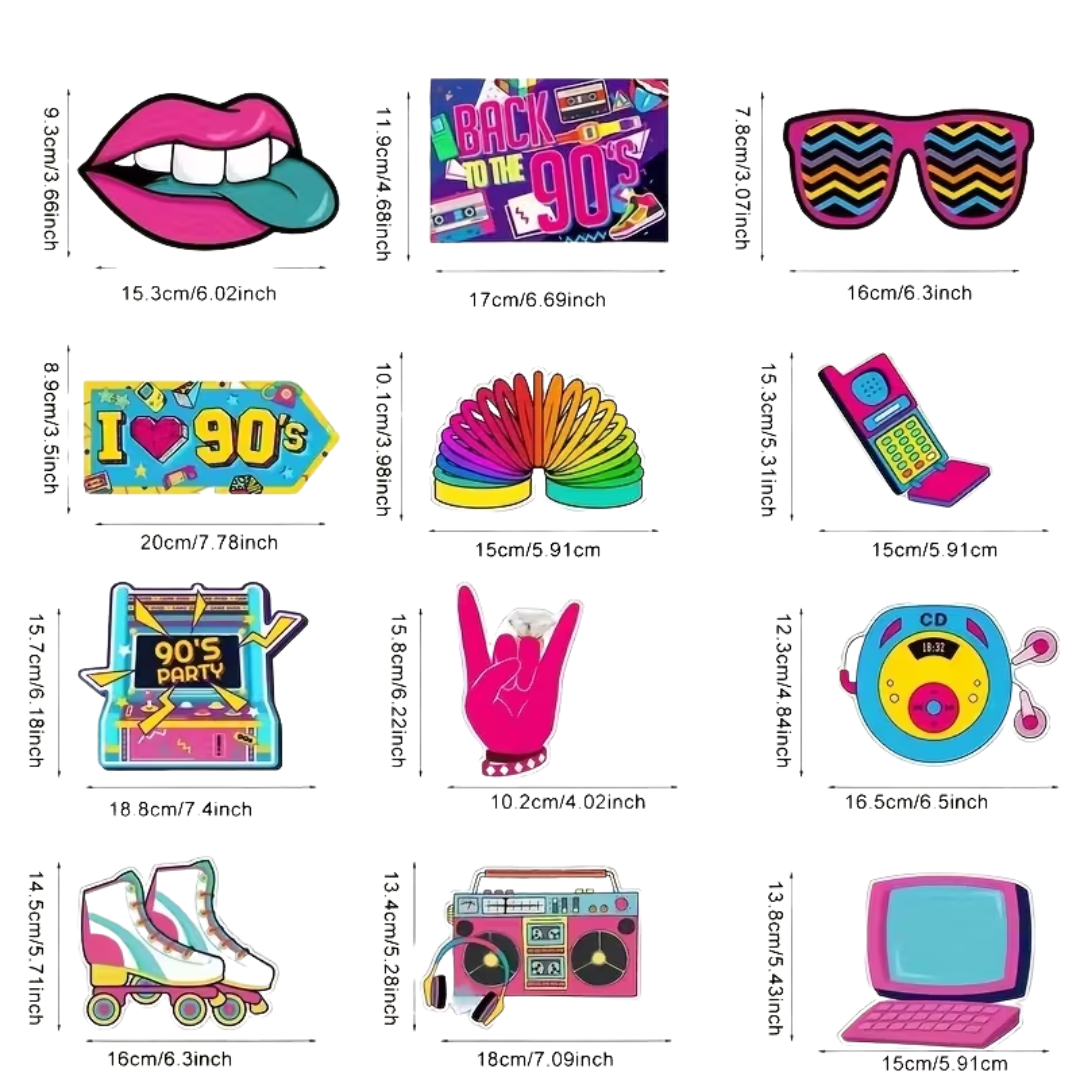Retro-Vibes für deine Party: Das 30-teilige Deko-Set mit ikonischen 90er-Motiven und Wirbelanhängern macht Wände, Decken und Fotobereiche im Handumdrehen zur Nostalgie-Zone.