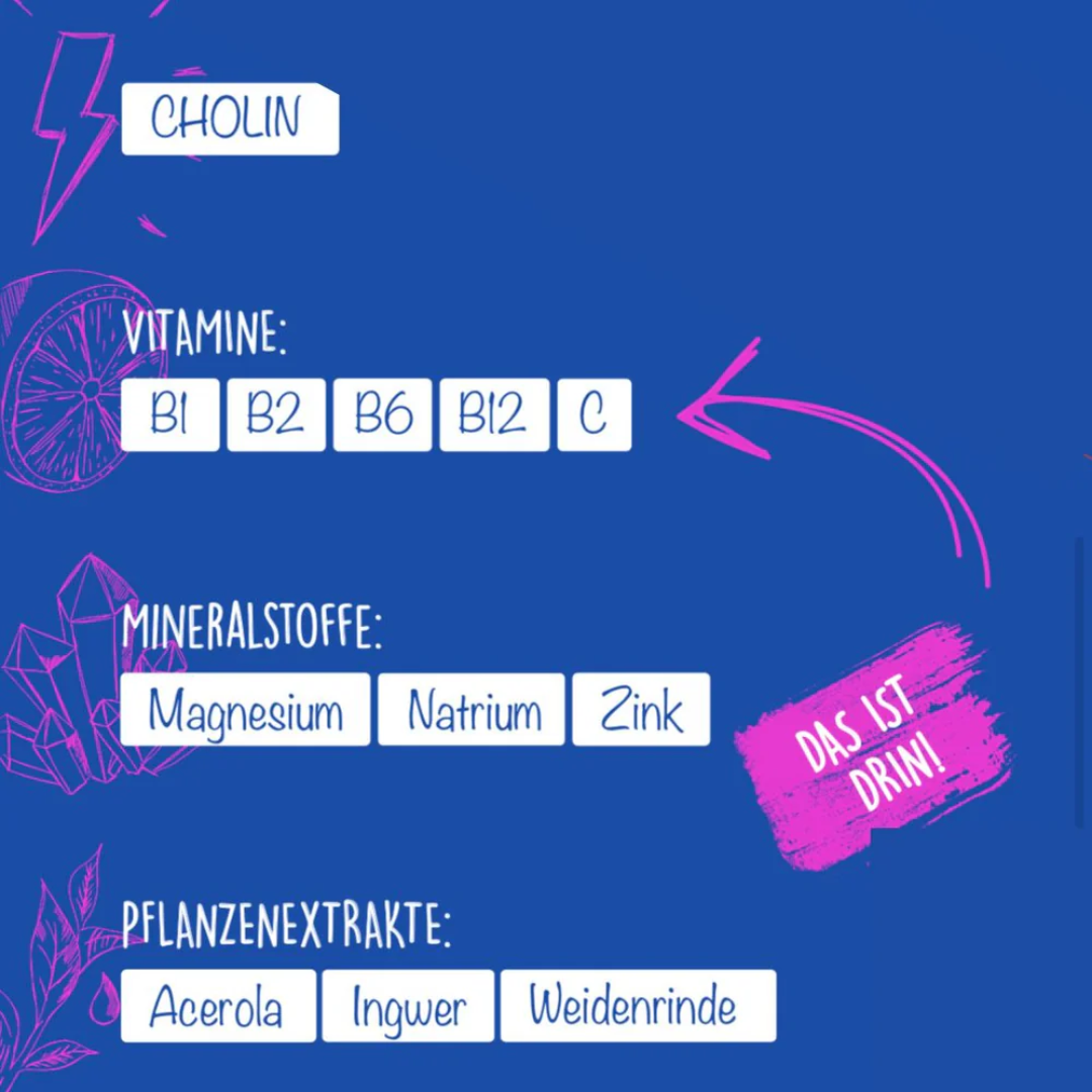 Ob nach einer durchfeierten Nacht, einem Festivalwochenende oder einer intensiven Trainingseinheit – dein Körper verliert wichtige Nährstoffe. Der BACK-TO-LIFE SHOT liefert dir alles, was du brauchst, um wieder in Schwung zu kommen. Dank hochwertiger Inhaltsstoffe wie Vitaminen, Mineralstoffen, Ingwer- und Weidenrindenextrakt bist du bestens versorgt. Genieße den Shot morgens nach der Party, beim Katerfrühstück oder einfach als täglichen Vital-Kick. Alkoholfrei, erfrischend und perfekt dosiert für maximale Wirkung.